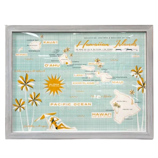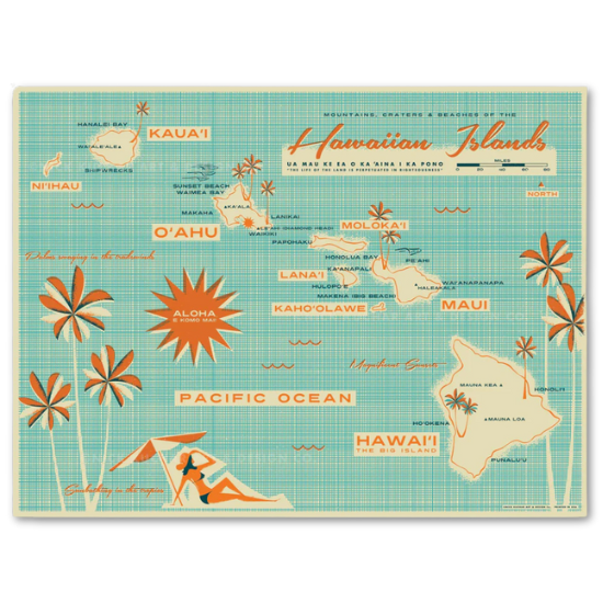 ニックが描くハワイ諸島地図は、さわやかなオフホワイトにゴールデン イエローとライト アクアのリフレッシュされたカラーで印刷されています。