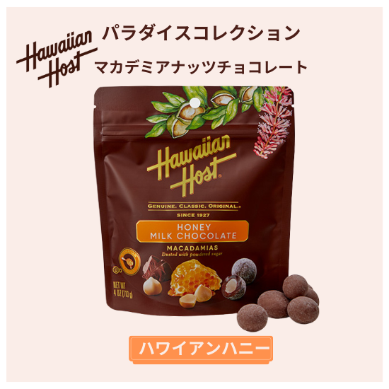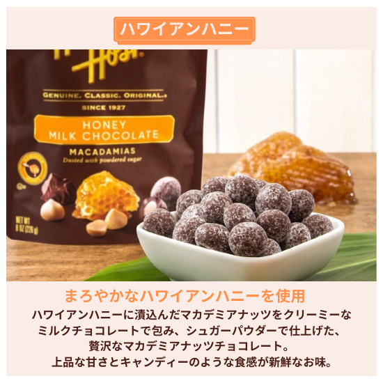 ハワイアンハニーに漬込んだマカデミアナッツをクリーミーなミルクチョコレートで包み、