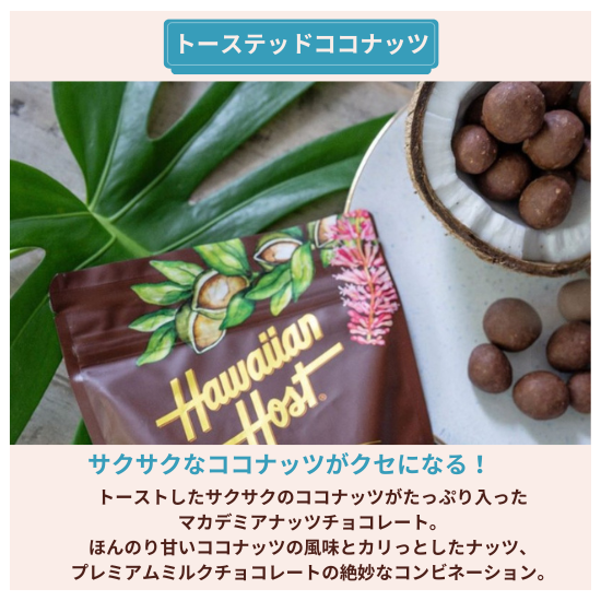 トーストしたサクサクのココナッツがたっぷり入ったマカデミアナッツチョコレート。
