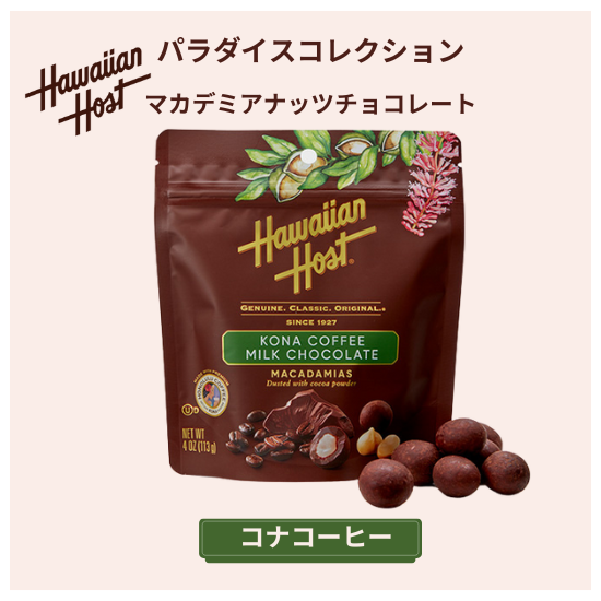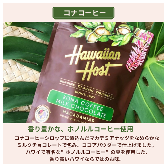 コナコーヒーシロップに漬込んだマカデミアナッツをなめらかなミルクチョコレートで包み、