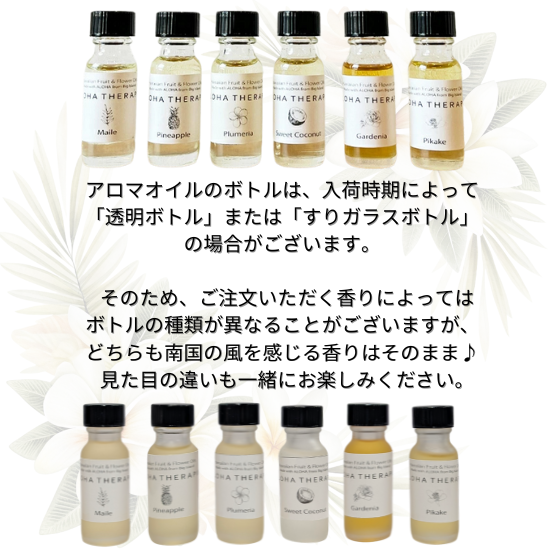 ※アロマオイルのボトルは、入荷時期によって「透明ボトル」または「すりガラスボトル」の場合がございます。
